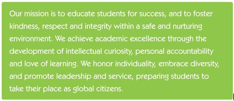 Our vision and mission is to educate students to success, and to foster kindness, respect and integrity within a safe and nurturing environment. We achieve academic excellence through the development of intellectual curiosity, personal accountability and love of learning. We honour individuality, embrace diversity and promote leadership and service, preparing students to take their place as global citizens.